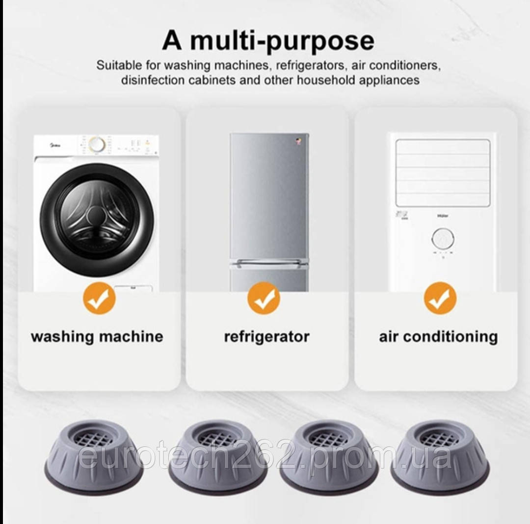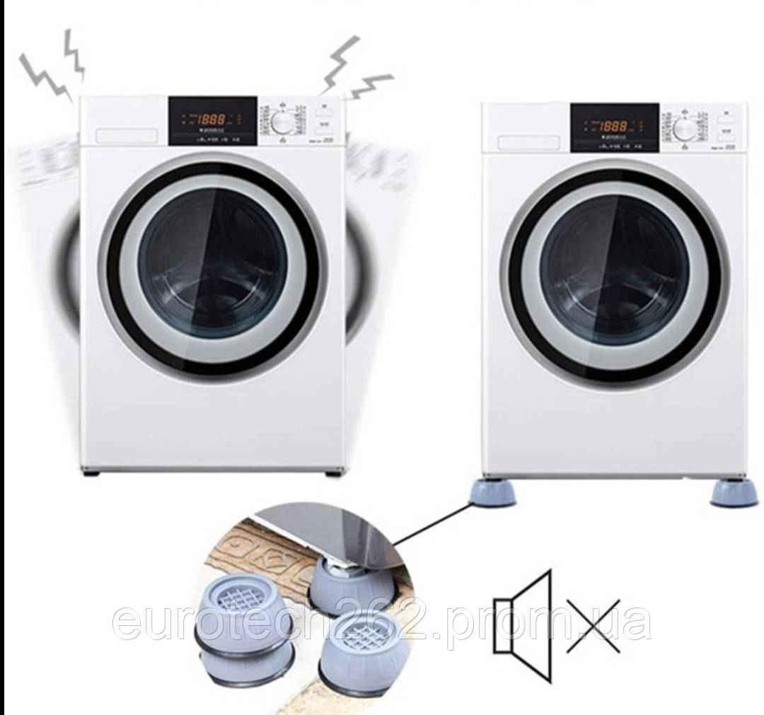 Антивібраційні підставки поглинають вібрації пральної або сушильної машини, даючи змогу техніці стійко стояти на підлозі. Це універсальні силіконові амортизувальні підставки для пральних машин. Ці подушки для ніжок пральної машини потрібні для того, щоб знизити її вібрацію під час процесу прання. Також, крім зниження коливання машинки, підставки виконують ще й інші функції. Вони не дають ковзати пральній машинці підлогою, не дають їй стрибати, а також знижують рівень шуму. У такий спосіб захищають підлогу від подряпин. Таке, здавалося б, незначне доповнення до Вашої машинки істотно допоможе вбудованим антивібраційним системам справлятися з їхнім завданням. Такі підставки дуже прості у використанні. Потрібно лише підкласти їх під ніжки машинки. Отже, якщо Ваша машинка стоїть на стійкій, рівній підлозі, у неї немає жодних явних поломок, а вона все-рівно шумить і стрибає — настав час купити підставки для пральної машини. Пробуйте — і Ви залишитеся задоволені!