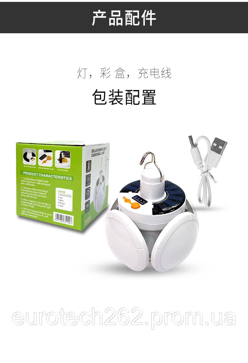 Представляємо вам ліхтар кемпенговий — справжній трансформер серед вуличних світлодіодних ліхтарів незалежно від того, чи перебуваєте ви в горах, лісі, чи на узбережжі, цей акумуляторний ліхтар буде надійним джерелом світла в будь-яких умовах. Дозвольте багатофункційному ліхтарю на сонячній батареї стати вашим надійним супутником у будь-яких туристичних пригодах. Незвичайний дизайн ліхтаря кемпенгового відразу впадає в око. Його стильний і сучасний вигляд привертає увагу та підкреслює ваш унікальний стиль. Підвісний, вологозахисний кемпінговий ліхтар НЕЗАМІННИЙ вуличний помічник для дачі та саду, гаража, полювання, риболовлі, ремонту або походу. Якісний LED Світильник на сонячній батареї з потужними світлодіодами! Світлодіодний ліхтар акумуляторний із сонячною батареєю являє собою акумуляторний освітлювальний пристрій, який упродовж дня накопичує сонячну енергію на інтегрованій батареї або за допомогою зарядного USB-пристрою. Індикатор заряджання акумулятора завжди підкаже вам, коли його пора зарядити. Бездротова лампа дуже проста у використанні, має 4 режими світла: тьмяний, середній, яскравий і мерехтливий SOS, забезпечена 5 світильниками, кожен із яких можна відрегулювати окремо, кут нахилу 90 градусів. Садова світлодіодна лампа з підвісним кріпленням (гачком), забезпечує однаково ефективне освітлення й від електромережі, і від вбудованого акумулятора, що розширює його функціональність і дає вам більше свободи в його використанні, порівнюючи з світильниками, які працюють тільки від сонця або заряджання. Не потребує дротів, ідеально підходить для дачі, альтанки, господарських будівель, гаража. Високоякісні світлодіоди забезпечують яскраве та рівномірне світло, яке дає змогу бачити все навколо з великим комфортом. Спеціальна система трансформації дає змогу швидко та легко змінювати форму та вигляд ліхтаря.Благодаря своєї гнучкості й універсальності, ліхтар легко виконає будь-яке завдання освітлення на вулиці.