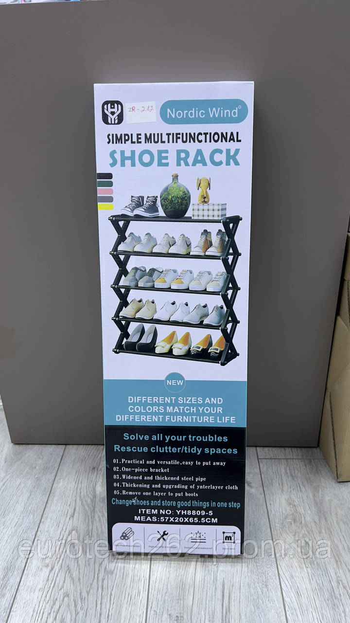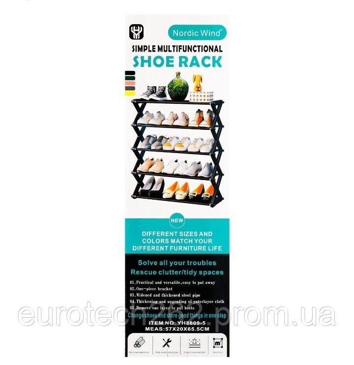 Для зберігання взуття поза сезоном завжди виникає питання пошуку місця. Часто взуття забирається в коробки, але там вона досить схильна до фізичного впливу – просто меніться. Невеликий розмір полиці дозволяє знайти для неї місце навіть в обмеженому просторі, а якщо у вас існує проблема розташування великої кількості пар взуття, ви можете встановити полицю в прихованому приміщенні Наявність тумби в сім’ях з дітьми, привчить їх до порядку та вміння доглядати за своїм взуттям. Купуйте сучасні, стильні, компактні полиці для взуття “Shoe Rack YH 8802-5” – це зробить ваш будинок тільки комфортнішим, чистішим і затишним. Характеристики: Полиця для взуття YH 8802-5 Тип: полиця для взуття; Вигляд: доладна; Ширина: 48 см.; Ширина між полицями 13 см.; Висота: 60,5 см.; Глибина 19см.; Розрахована на 8-10 пар взуття; 5-рівнева складна система; Легко збиратися та розумітися; Матеріал каркасу: пластик; Пластикові рознімання та компоненти міцно складені. Комплектація: Полиця для взуття YH 8802-5 Полиця для взуття – 1 шт.; Упаковка: заводська коробка.