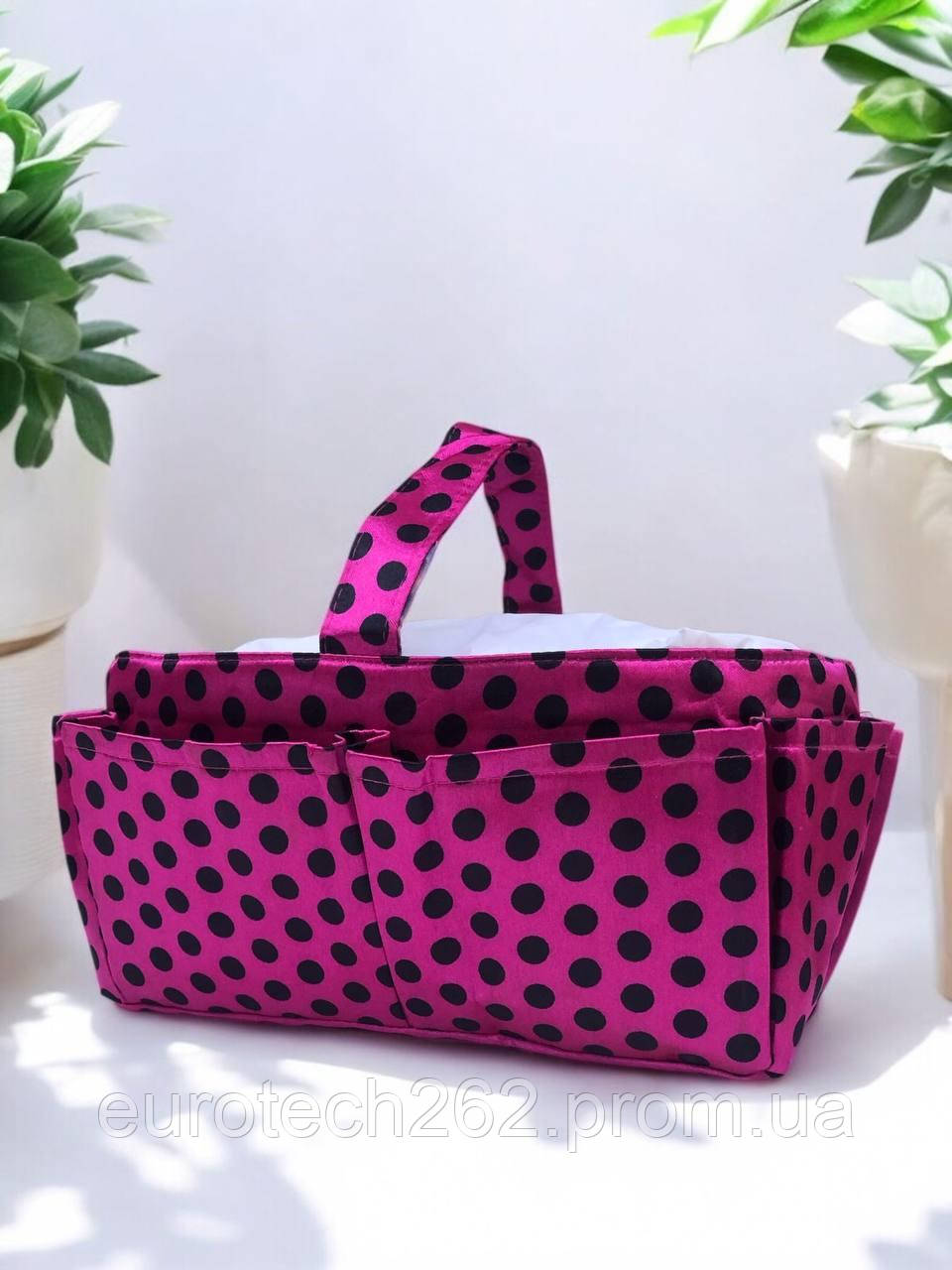 Яскравий та практичний органайзер для сумки у насиченому малиновому кольорі з чорним горохом. Зручний для зберігання косметики, гігієнічних засобів, канцелярії, дрібних аксесуарів та інших необхідних дрібниць.