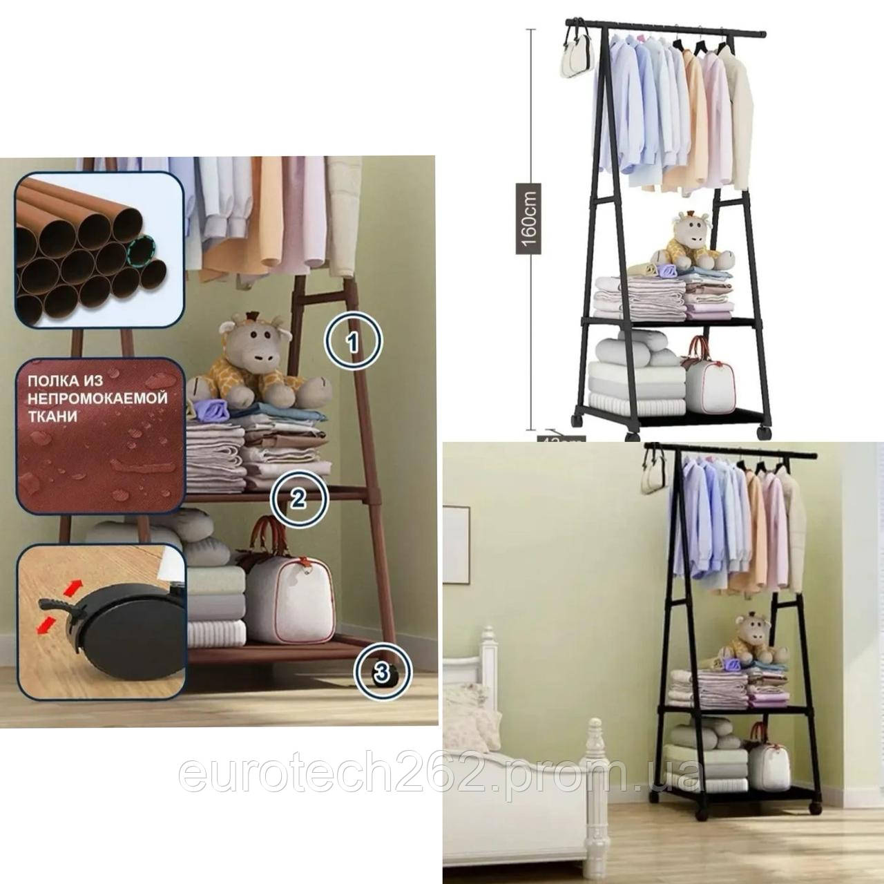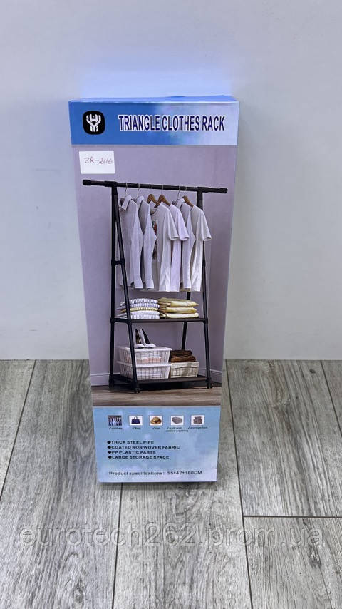 Coat Rack Pro — алюмінієва стійка-вішалка з навантаженням до 30 кг, 2 полицями й 1 перекладиною. Цей продукт вигідно для зберігання речей, особливо в обмежених просторах, де вільного місця мало. Збирання цієї стійки здійснюється без використання болтів або гвинтів і займе лише кілька хвилин (в середньому 20-30 хвилин). Всі трубки з'єднуються пластиковими замками. Пристрій виготовлений із легкого та міцного алюмінію, покритого захисною фарбою чорного кольору. Його вага всього 1.5 кг. Завдяки пластиковим заглушкам на кінцях труб, ваш одяг буде захищений від пошкоджень і випадкового випадання. Особливістю цієї моделі є маленькі коліщатка, які дають змогу пересувати стійку навіть у повністю навантаженому стані. Стійка-вішалка виготовлена в трикутному форматі, що забезпечує впорядковане та компактне розміщення одягу. Дві полиці ідеально підходять для складених речей, а використання поперечини для вішалок дає змогу максимально оптимізувати використання стійки.